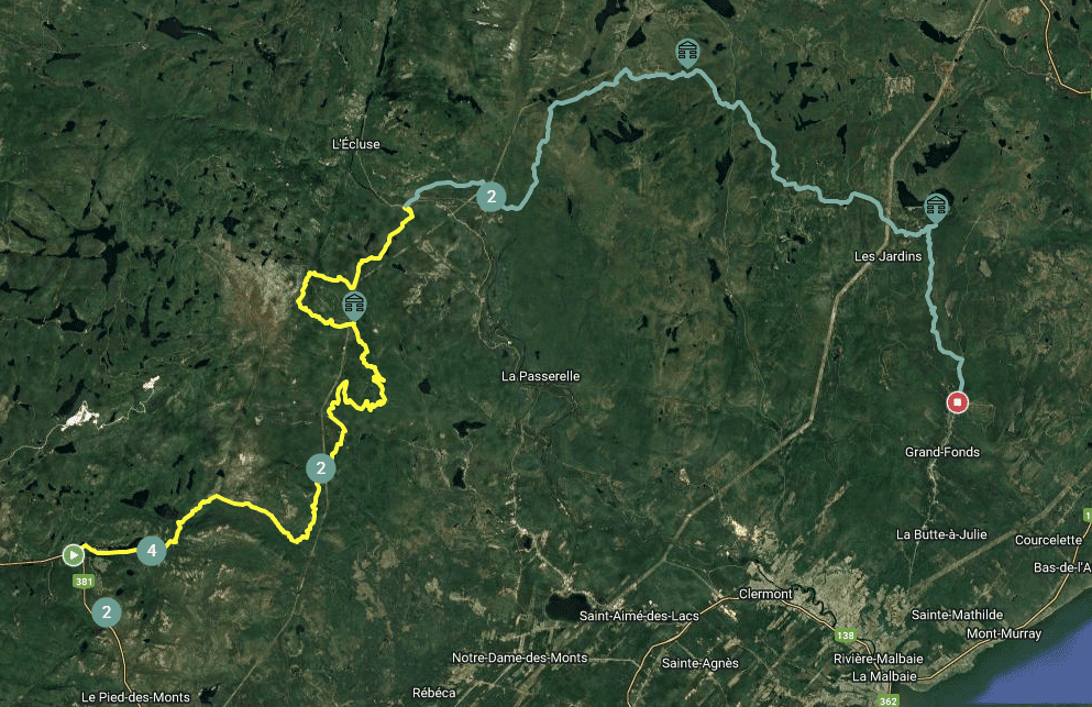 54 km avec dénivelé total : +1434 m / -1266 m (chalets : Geai Bleu, Coyote, Épervier) - Il est obligatoire de réserver à l’avance et de se présenter au bureau (km 10,6 route 381) pour l’enregistrement et les informations.
