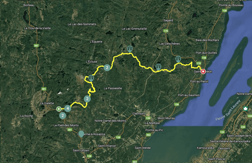 Notez qu’il est également possible de faire une nuitée de plus chez ÖBois Charlevoix qui se trouve à 13 km du refuge sur l’Orignac. Il vous restera ensuite environ 7 km à faire pour arriver à St-Siméon. Contactez directement ÖBois Charlevoix pour faire votre réservation pour cette nuitée.